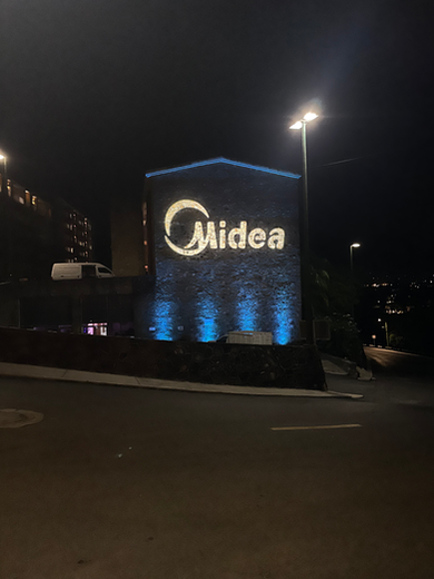 Al exterior del venue proyectamos iconos y logotipos de marca en la fachada de Plaza Auriga y pintamos los muros con luz arquitectónica wash color y disparamos rayos de luz hacia el cielo con robóticas Skyline.